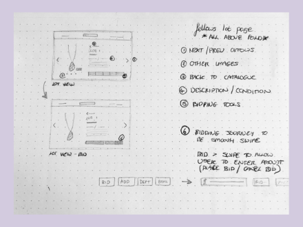 The solution was to have the information swipe in when requested by use of “description” and “condition report” buttons. This kept all the information above the fold and did not interfere with bidding. The new redesign was first sketched out to think about placement of all required objects, before being made into an interactive protoype with Adobe XD to display to the client, covering all user journeys.